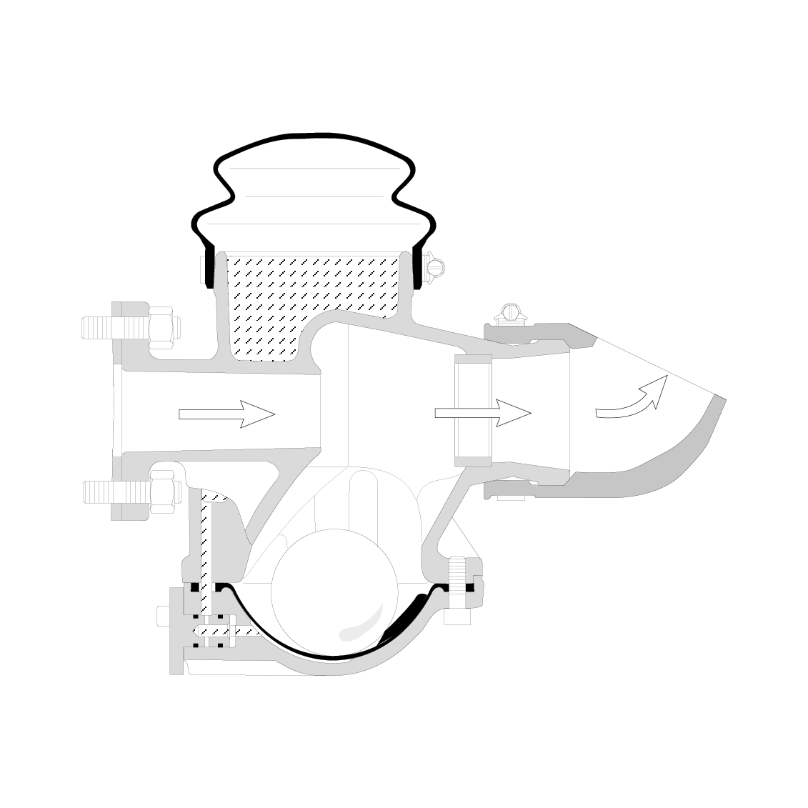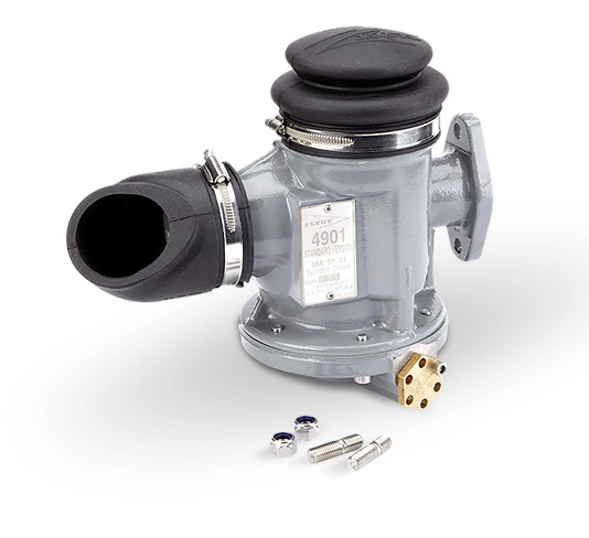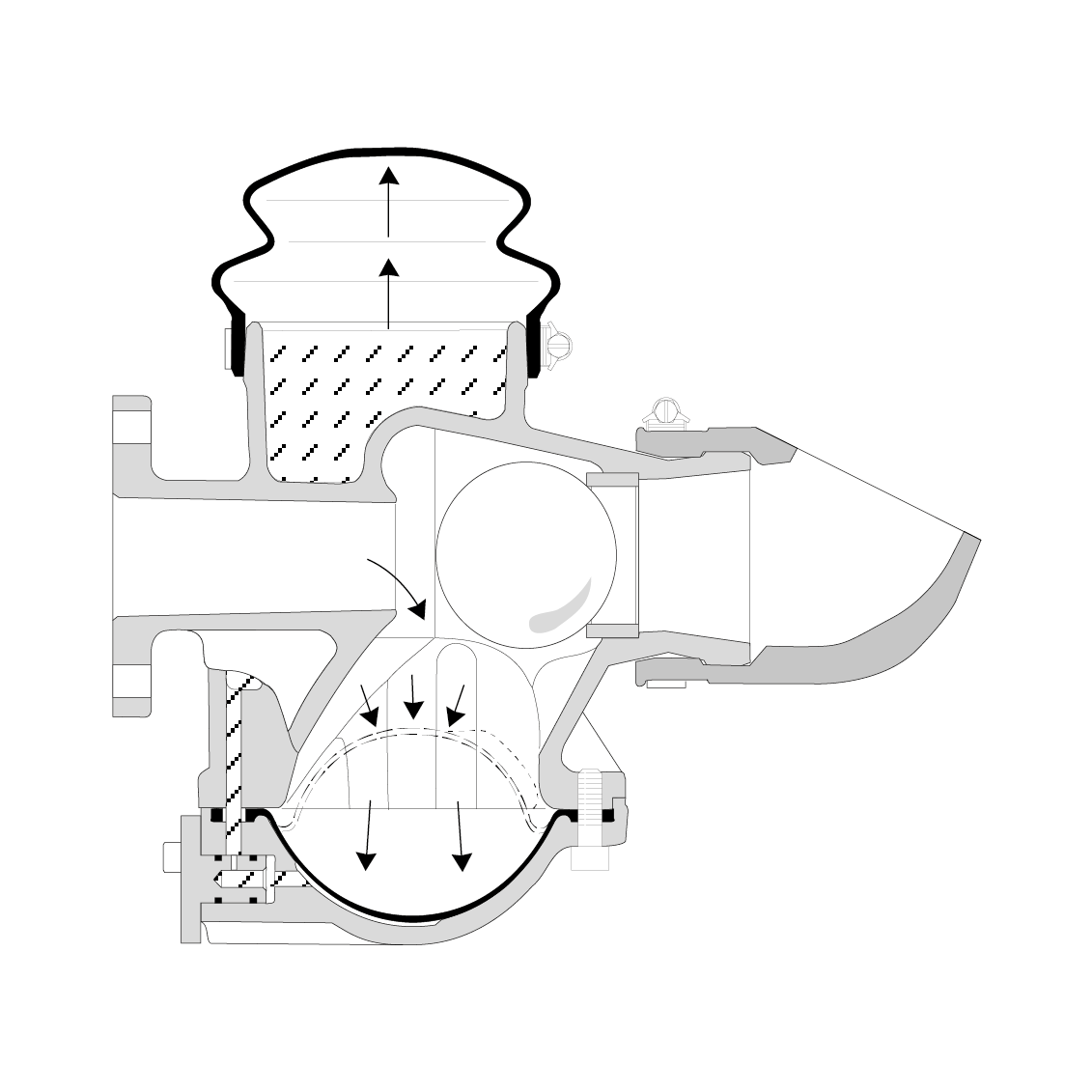 La válvula está abierta cuando la bomba se pone en marcha. El flujo de ésta circula por la válvula y limpia el pozo de la bomba. En el cuerpo de la válvula se produce un vacío inducido por el flujo. Dicho vacio empieza a invertir las posiciones de las membranas superior e inferior y eleva la bola.