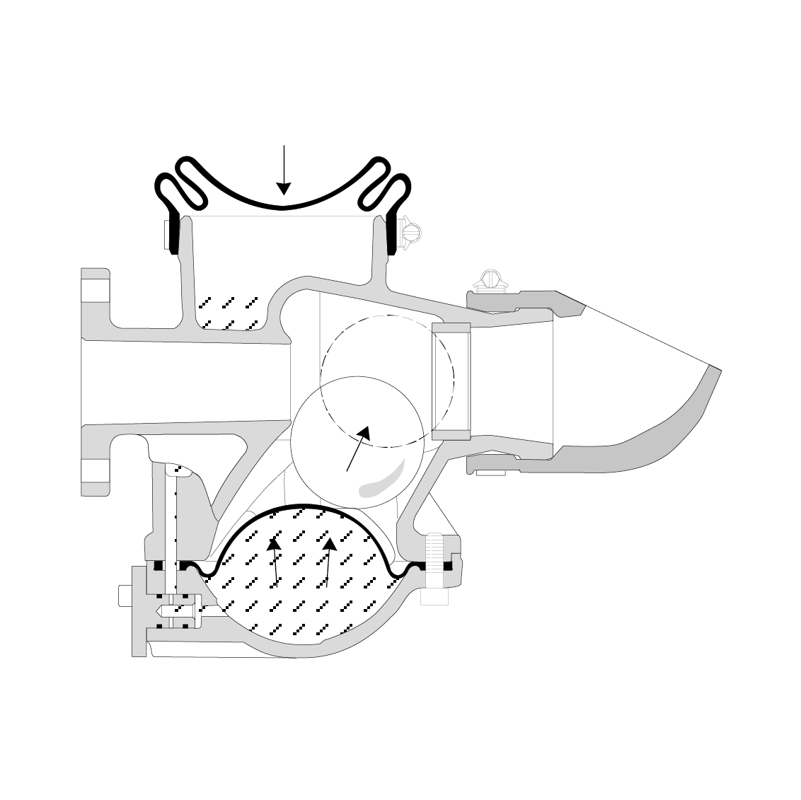 Al cabo de aprox. 20″, el aceite de la cámara pasa al espacio entre la membrana inferior y el fondo del cuerpo de la válvula, a través de la válvula de regulación, forzando la membrana inferior a invertirse, impulsando así la bola hacia el chorro de líquido. Entonces la bola obstruye el flujo por la válvula y la bomba empieza a extraer el líquido del pozo.