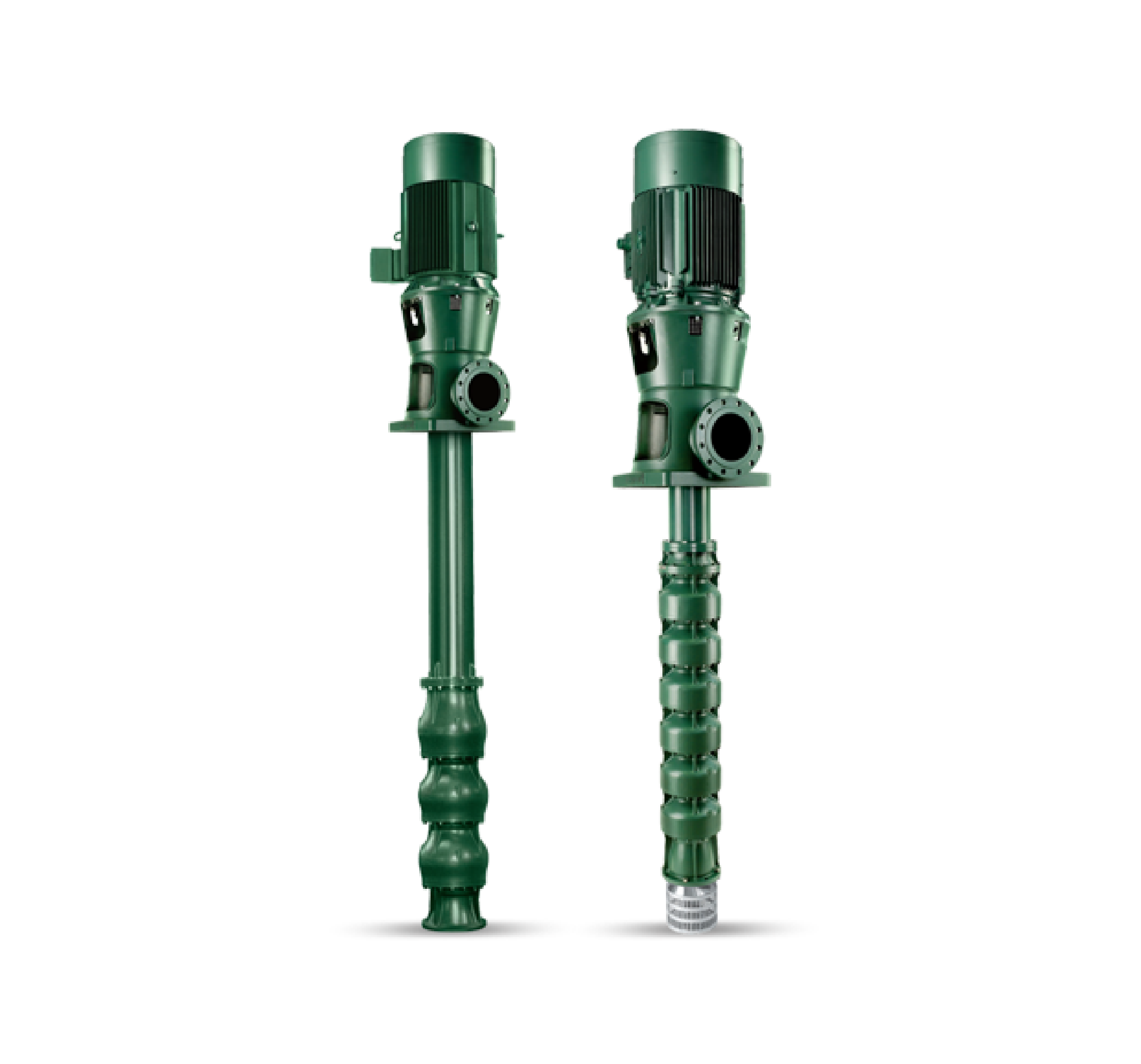 Bomba para pozos profundos según AWWA E101-88 con cuerpos de álabes guía partidos radialmente, anillos de desgaste e impulsores recambiables; juego de tubos ascendentes con rodamientos y tubos ascendentes recambiables de prolongación modular para diversas profundidades de inmersión.